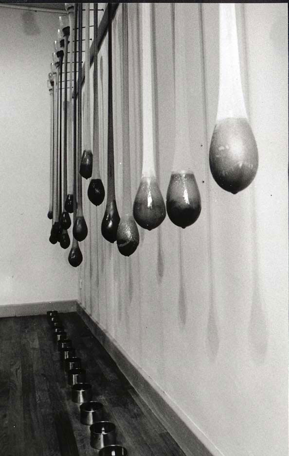 Ever so slowly over the exhibition period, ten litres of golden honey transferred from inverted glass jars mounted high on the gallery wall down through the fleshy tones of twenty silk stockings, into golden metal tins below. Honey is a sweet high-energy food, and when combined with silk stockings rather erotic. Silk stockings were a luxurious gift for women, particularly during World War two, because of their scarcity. The bombing of Pearl Harbour stopped the flow of Japanese silk and nylon, which was directed into the production of parachutes.