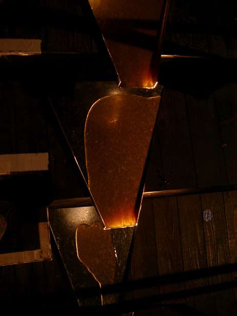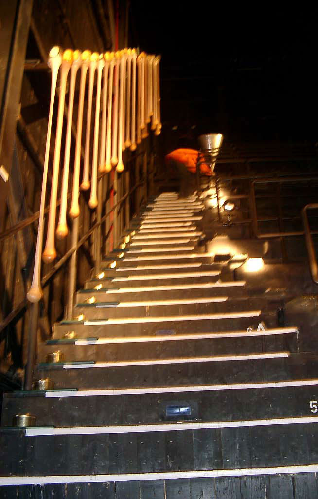 The exhibition was expanded to install in the Kubus, an architecturally designed iconic black box theatre space in the historic Ilm Park in Weimar. Twentythree honey drippers ran down the sidewall of a steep staircase that led to high-tiered seating above the triangular stage. On the opposite side of the stairs, at the very top and back of the theatre, a thirty litre conical vat of honey was suspended and slowly drained over the period of the exhibition. A slow motion golden cascade of honey flowed down across the tiered seating directed by a series of aluminium trays that were lit from beneath, which made the honey glow in the darkened theatre space and acted to warm the honey to release its sweet scent into the air.