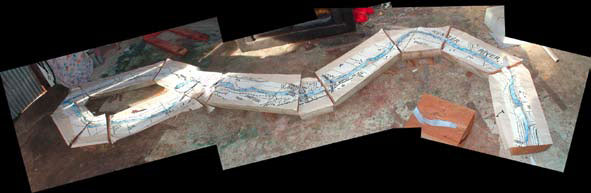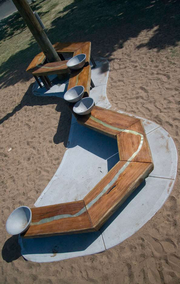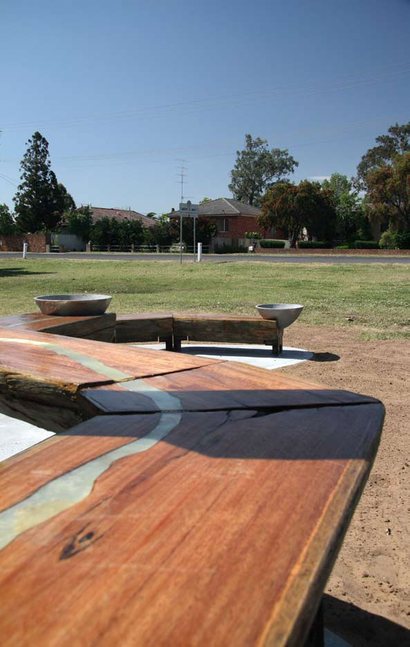 The sculpture is an organic form, constructed from timber, which follows the shape of the river. Four levels, from high to low flow in the direction that the river flows – down toward the sea. A map of the Hunter river is carved into the timber surface of each level, inlaid with silver aluminium plate. At one end of each level is an aluminium bowl. The bowls are sand cast from hand carved patterns, from reclaimed aluminium (collected by the community). The bowls are placed on the river map to represent the four bridges. On the highest level of the sculpture the river splits into two arms and rejoins again further south. In the loop created, a vertical element shoots skyward. This pole is tapered at the top; the point is coated with aluminium plate, a landmark and beacon, glinting in the sun. Bands of aluminium decorate the pole reminiscent of the rise and fall of the river in flood over time.