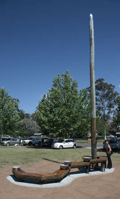 The sculpture was built by Tricia Flanagan and the Singleton Public Art Committee and given to the community of Singleton. The centre pole was sculpted on site at Town Head Park and erected by Energy Australia. The lower section of the sculpture was constructed in a studio at Redbarn Gallery on Sheri McEvoy’s (a committee member) property at Elderslie. The work was moved by truck to Town Head Park and installed with a crane and cemented into concrete footings in July 2007. A concrete footprint under the sculpture completed the installation.
