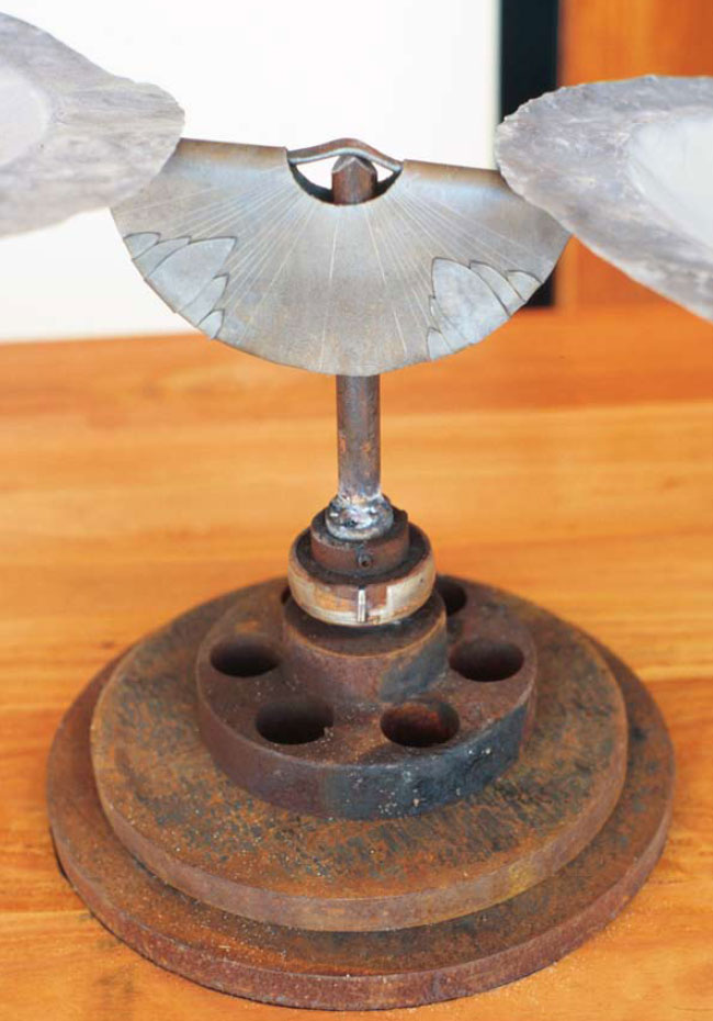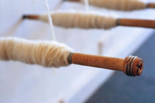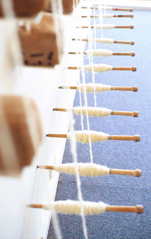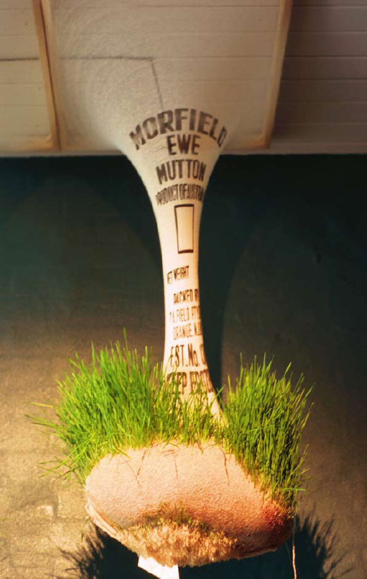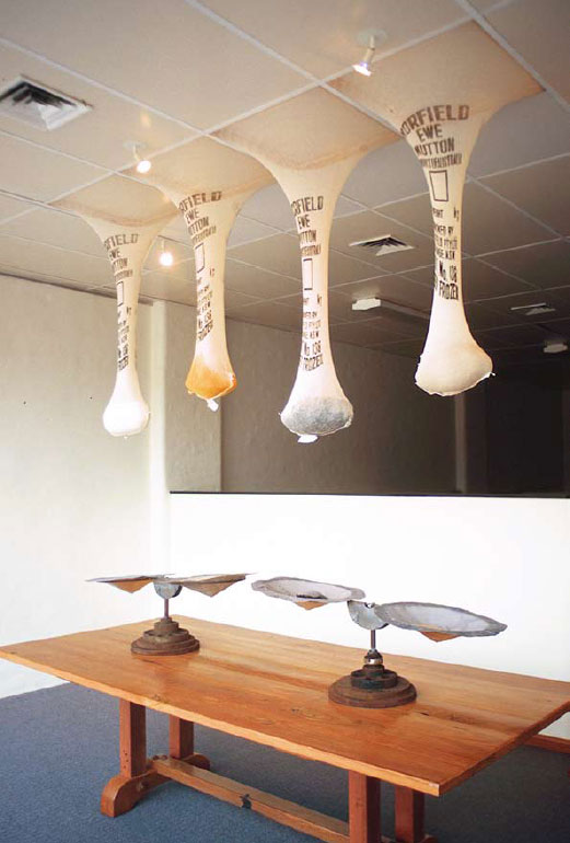 The overgrazing by introduced species, hard hoofed animals such as sheep and cattle, have led to massive damage to the Australian environment. The wool industry is referred to as the backbone of Australia. It is acknowledged in ‘Token’ by the presence of a construction resembling a loom in which miniature bales of woollen fleece are mounted on small shelves. From the bales of wool a yarn is drawn and spun, travelling some meters up the wall over meat hooks and down again to just above floor level where it is collected on timber bobbins. The underlying experience of this space of the exhibition is that of control. It is climate controlled, sterile, measured and accounted for. The presence of a boardroom table confirms the underlying bureaucracy.