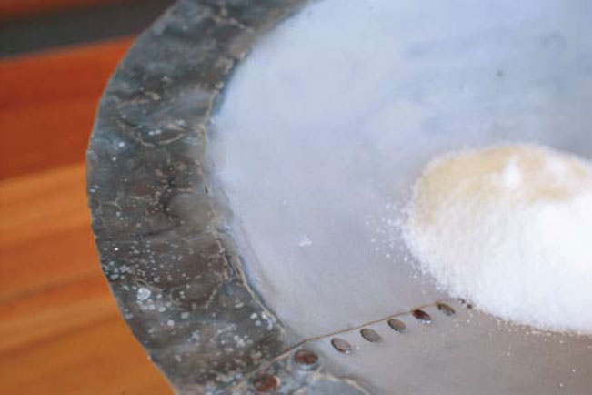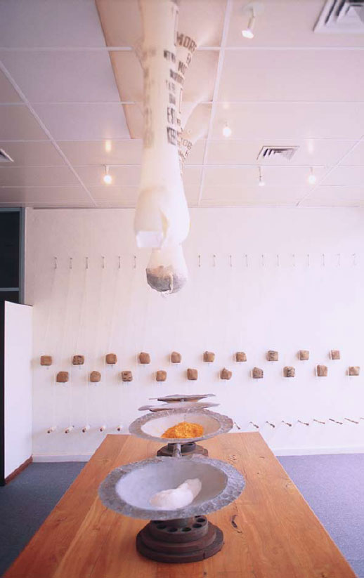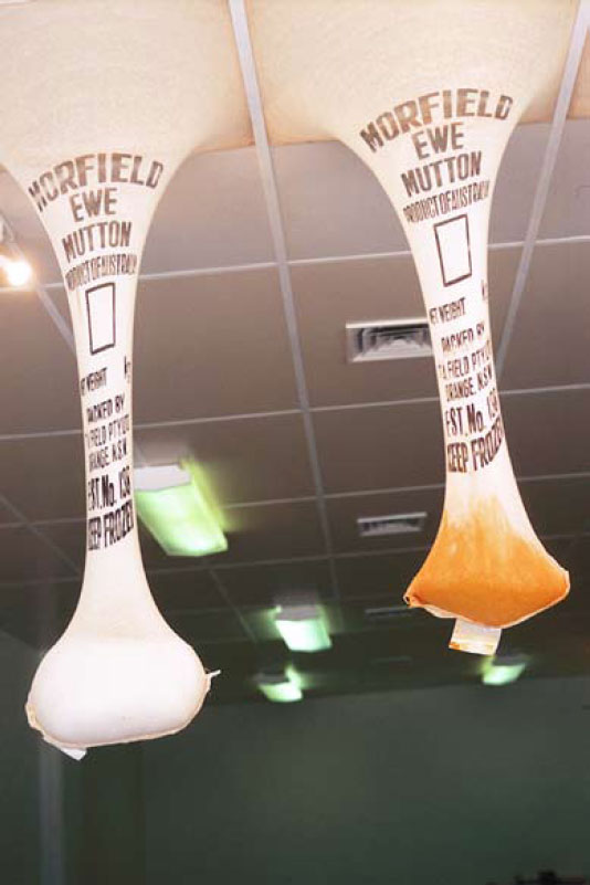 Large bulbous mutton bags stretch from the ceiling filled with a variety of substances; sand, coal, turmeric and salt permeate the bags and are collected in sets of scales sculpted from recycled metals. The substances each tell a story; turmeric, refers to the early spice trade; coal is a non-renewable resource that is exported in massive quantities daily through Newcastle harbour; salt is also an export commodity but is indicative of saline soils – a by-product of intensive farming; similarly sand is exported and acts as an iconographical reminder of deserts and Australia’s arid wastelands.