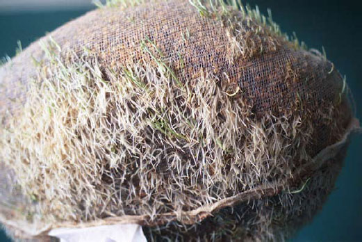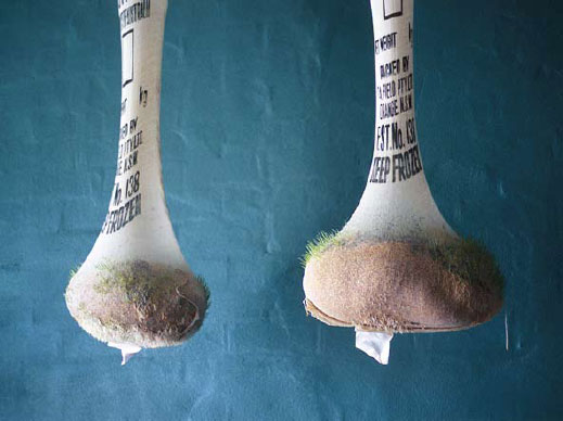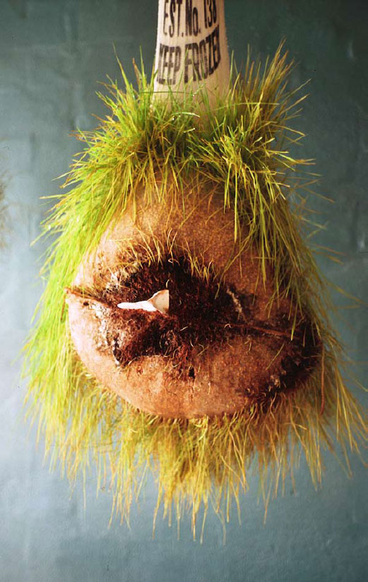 The foyer is alive with dripping noises. In the humidity, mutton bags are sprouting wheat grass. The growing works have their own sprinkler system intermittently switching on and off occasionally wetting unsuspecting onlookers. Scales are set in motion by the dripping and spraying and collect the excess water and direct it into potted trees situated under the scales.