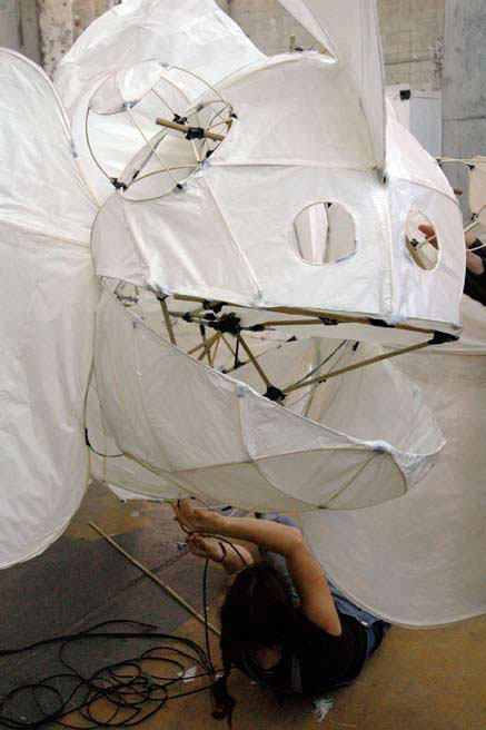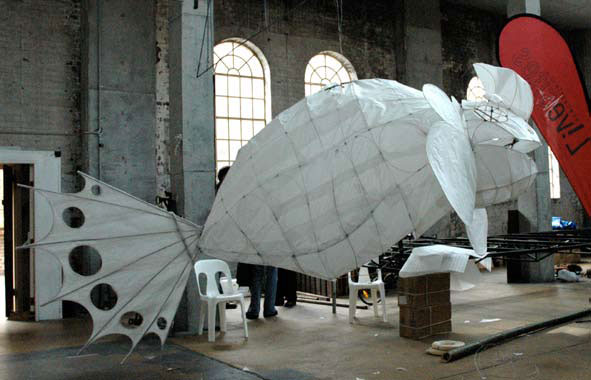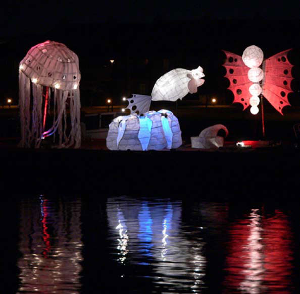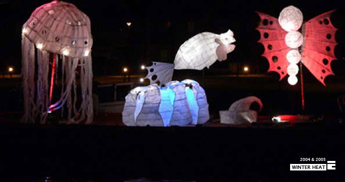 In 2005 the event was repeated but this time Flangan’s workshops focused on creating much larger paper lanterns. Forming a partnership with the local art and design schools, Flanagan worked with the students and other members of the public on a theme of sea creatures and mythical beasties. The resulting creatures floated on individual barges built from wooden pallets, and atop a twelvemeter barge past the crowd of two thousand spectators.
